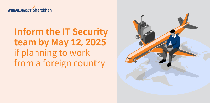 May 9, 2025 If you plan to travel or are already working abroad, notify the IT Security team with a business justification by May 12, 2025, to continue accessing company systems. IT Security policy restricts staff from working outside India, and you will lose access to VPN, email, Microsoft 365, and Azure services. For more information, please write to the IT Security team at istf@sharekhan.com. Note: For Dubai branch users can continue to work from Dubai and India. |