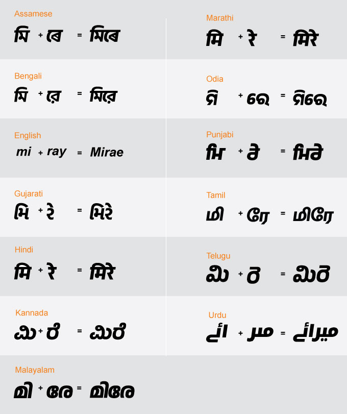 Phonetic spelling of Mirae in some key Indian languages